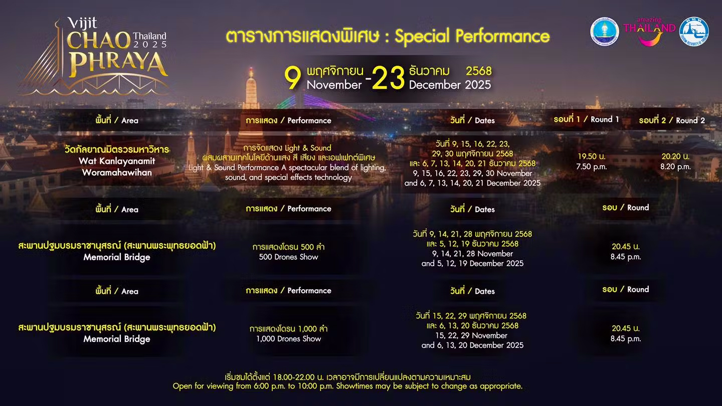 ตระการตากับการแสดงมากมาย บริเวณริมแม่น้ำเจ้าพระยา "แสดงตลอดทุกวัน" ตั้งแต่ วันที่ 9 พฤศจิกายน – 23 ธันวาคม 2568 รับประกันล่องเรือชมงานวิจิตรเจ้าพระยา ได้ประสบการณ์ที่สุดประทับแบบหาที่ไหนไม่ได้แน่ ๆ ห้ามพลาดโดยเด็ดขาดเลยนะคะ 1 ปีมีแค่ครั้งเดียว
