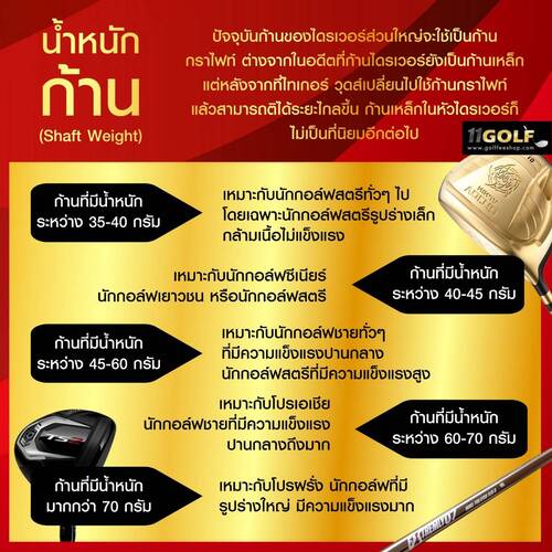 น้ำหนักก้าน (Shaft Weight) ปัจจุบันก้านของไดรเวอร์ส่วนใหญ่จะใช้เป็น ก้านกราไฟท์ ต่างจากในอดีตที่ก้านไดรเวอร์ ยังเป็นก้านเหล็ก แต่หลังจากที่ไทเกอร์ วุดส์ เปลี่ยนไปใช้ก้านกราไฟท์ แล้วสามารถตีได้ ระยะไกลขึ้น ก้านเหล็กในหัวไดรเวอร์ก็ไม่เป็น ที่นิยมอีกต่อไป ก้านที่มีน้ำหนักระหว่าง 35-40 กรัม เหมาะกับยักกอล์ฟสตรีทั่วๆไป โดยเฉพาะนักกอล์ฟสตรีรูปร่างเล็ก กล้ามเนื้อไม่แข็งแรง ก้านที่มีน้ำหนักระหว่าง 40-45 กรัม เหมาะกับนักกอล์ฟซีเนียร์ นักกอล์ฟเยาวชน หรือนักกอล์ฟสตรี ก้านที่มีน้ำหนักระหว่าง 45-60 กรัม เหมา...
