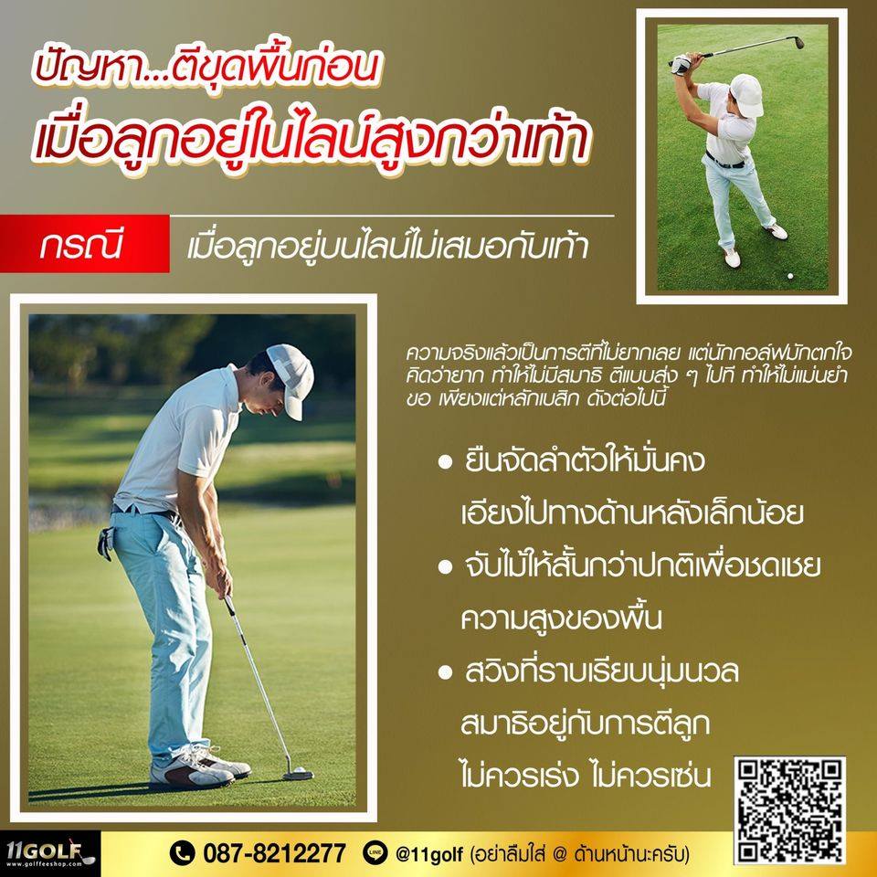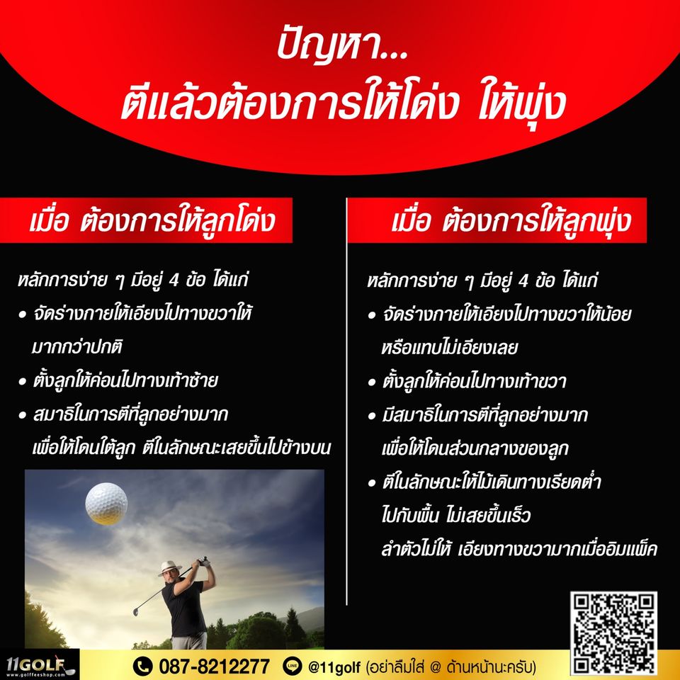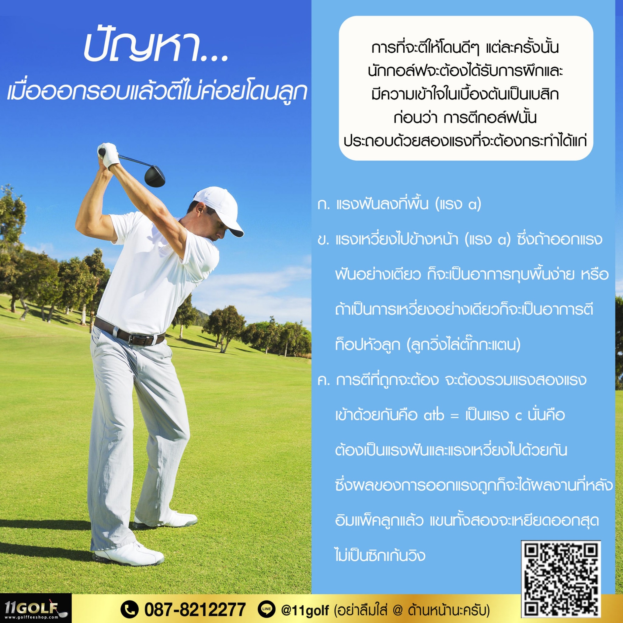ปัญหา...เมื่อออกรอบแล้วตีไม่ค่อยโดนลูก การที่จะตีให้โดนดีๆ แต่ละครั้งนั้น นักกอล์ฟจะต้องได้รับการผึกและ มีความเข้าใจในเบื้องต้นเป็นเบสิกก่อนว่า การตีกอล์ฟนั้น ประกอบด้วยสองแรงที่จะต้องกระทำได้แก่ . ก. แรงฟันลงที่พื้น (แรง a) . ข. แรงเหวี่ยงไปข้างหน้า (แรง a) ซึ่งถ้าออกแรง ฟันอย่างเตียว ก็จะป็นอาการทุบพื้นง่าย หรือ ถ้าเป็นการเหวี่ยงอย่างเดียวก็จะเป็นอาการตี ท็อปห้วลูก (ลูกวิ่งไล่ตั้กะแตน) . ค. การตีที่ถูกจะต้อง จต้องรวมแรงสองแรง เข้าด้วยกันคือ atb = เป็นแรง c นั่นคือ ต้องเป็นแรงฟันและแรงเหวี่ยงไป...