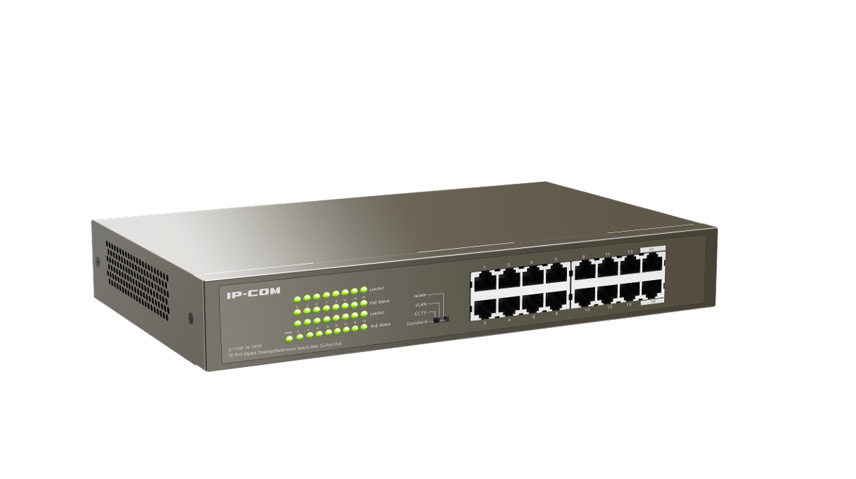 TEG1116P-16-150W is a Tenda PoE Switch that offers 16 10/100/1000Mbps Base-TX RJ45 ports 1-16 comply with IEEE 802.3af standard (maximum PoE power output: 15.4 W) and 802.3at standard (maximum PoE power output: 30 W). The switch offers a maximum PoE power output of 135W and can supply power to and exchange data with APs, IP cameras and IP phones through CAT5 cables. It also provides simple management modes such as CCTV, VLAN and isolation to help reduce cabling costs of IP terminals like APs and IP cameras.