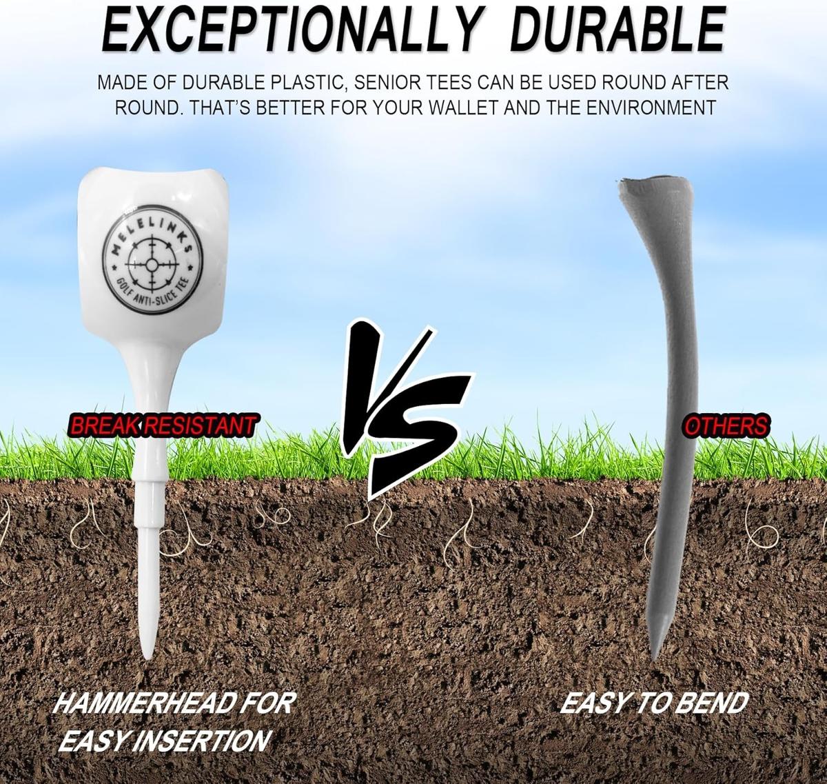 ทีกอล์ฟทำจากพลาสติกที่แข็งแรงและทนทานซึ่งไม่โค้งงอหรือแตกหักง่ายระหว่างการใช้งาน สามารถใช้งานได้นานและมีเสถียรภาพที่ดี มีอายุการใช้งานยาวนานกว่าทีกอล์ฟไม้และยัง นำกลับมาใช้ใหม่ได้