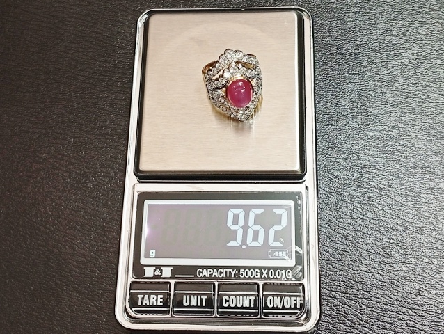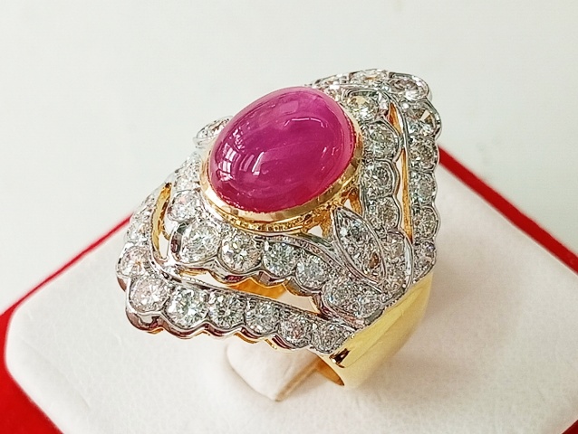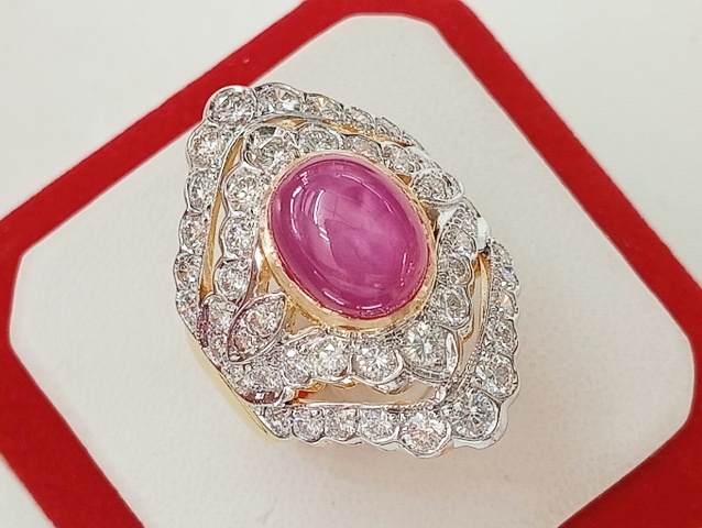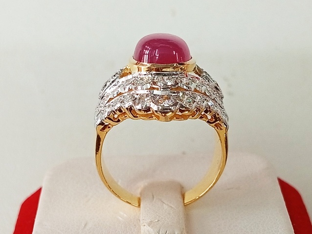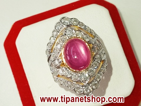 แหวนทอง 77% ทับทิม ทรงหลังเบี้ย มี สตาร์ เหลือบแสงด้านหน้า 5 กะรัต