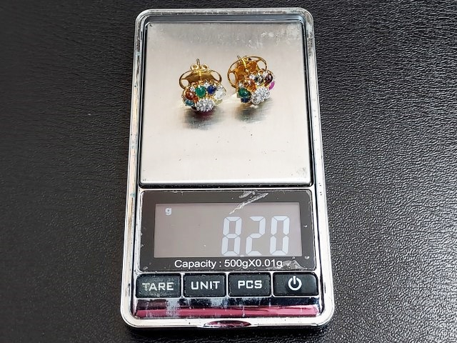 น้ำหนักรวม 8.2 กรัม แป้นต่างหูมีลาย กว้าง 1.3 ซม. ต่างหูกว้าง 1.4 ซม.