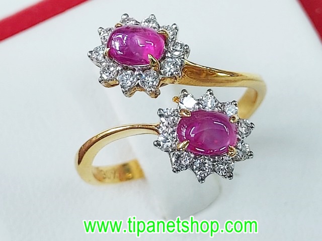 แหวนเพชรหลุดจำนำ ทอง18K ทรงไขว้ ทับทิม เล่นไฟ มีสตาร์ เนื้อแก้ว 3 x 4 มิล