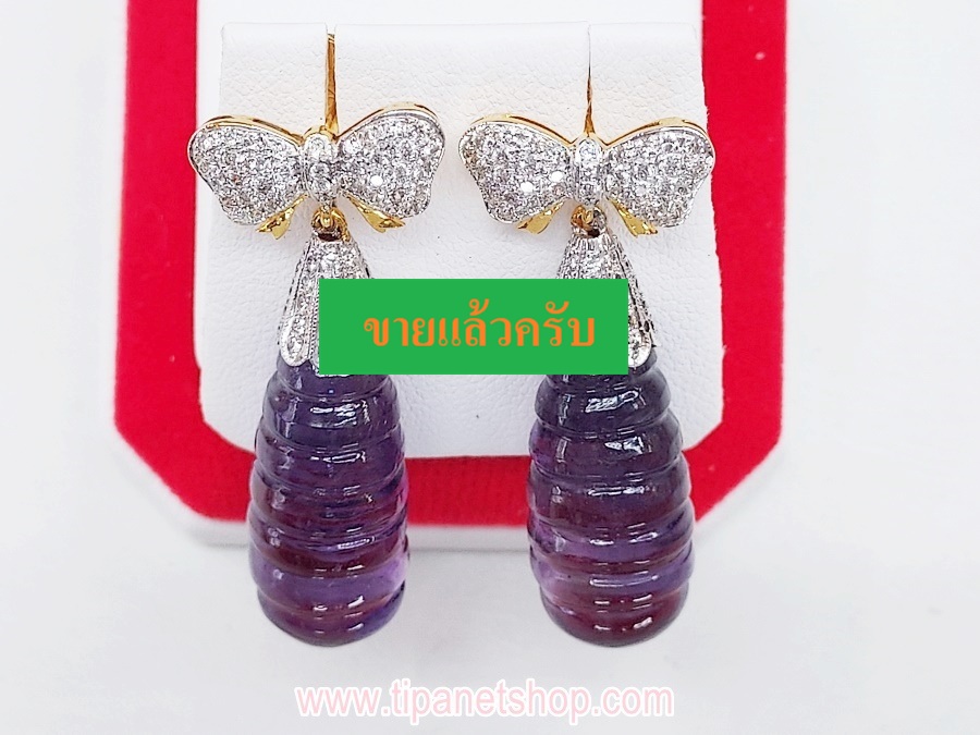 ต่างหูทอง18K ทรงระย้า พลอย อมิทีส สีม่วง เจียร
