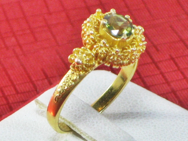แหวนทอง90% ทรงช่อโบราณ พลอย เขียวส่อง เจียร ขนาด 5 * 6 มิล