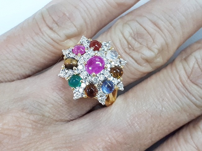 แหวนทองK ทรงนพเก้า พลอยต่างๆ เม็ดยอดทับทิิม ทรง กลม หลังเบี้ย เกาะเตย