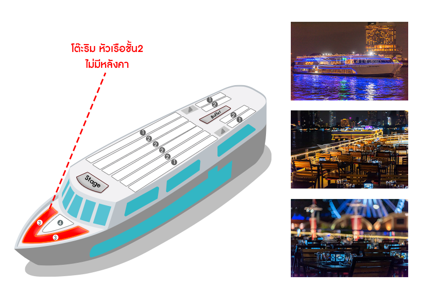 โต๊ะริม หัวเรือชั้น2 ไม่มีหลังคา![]() คลิกดูรูปที่นั่ง |