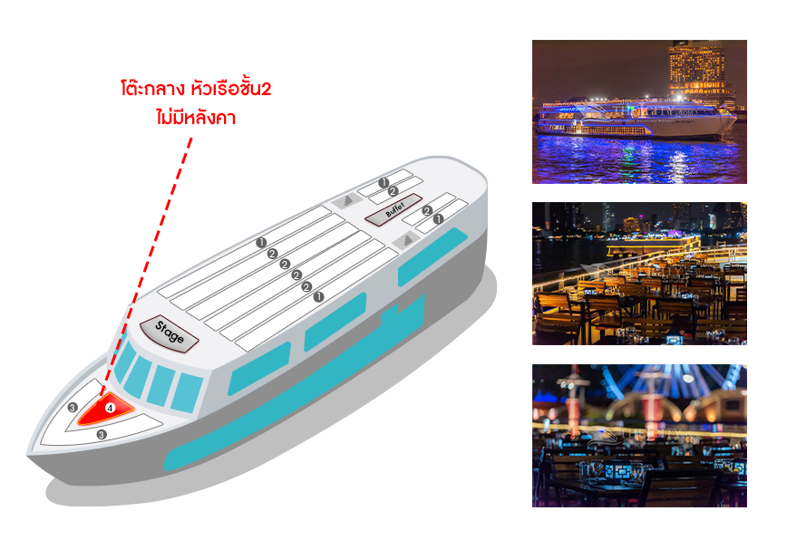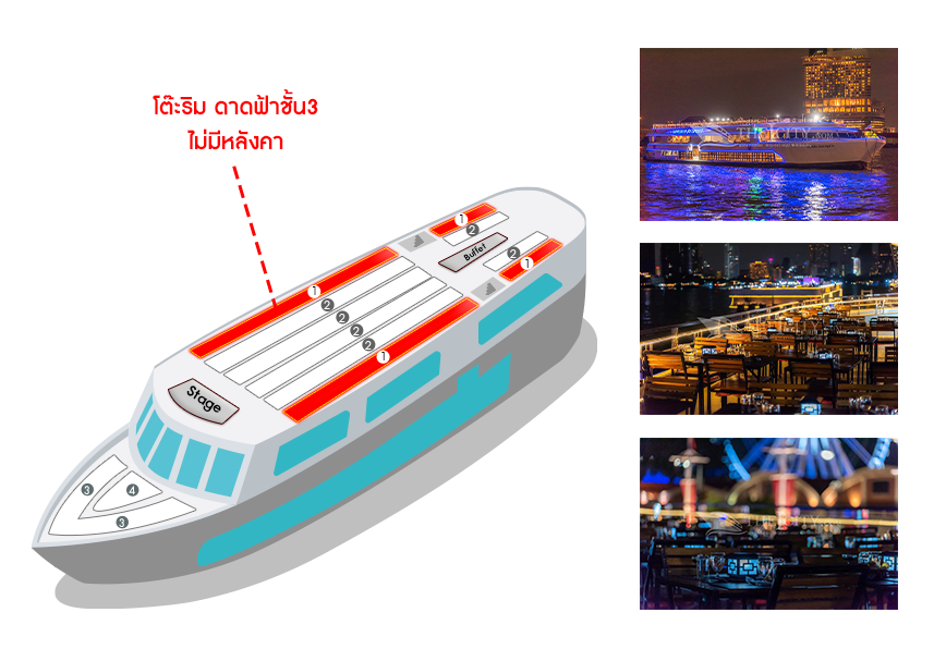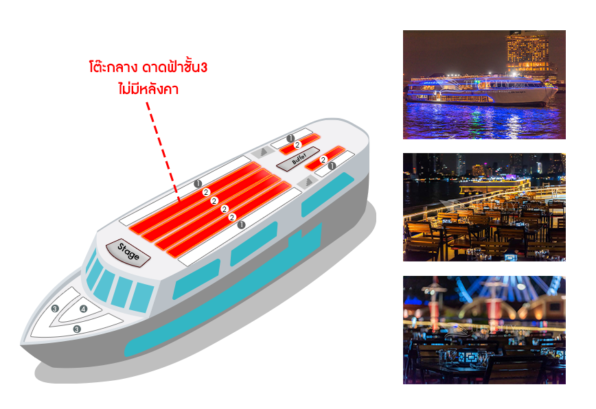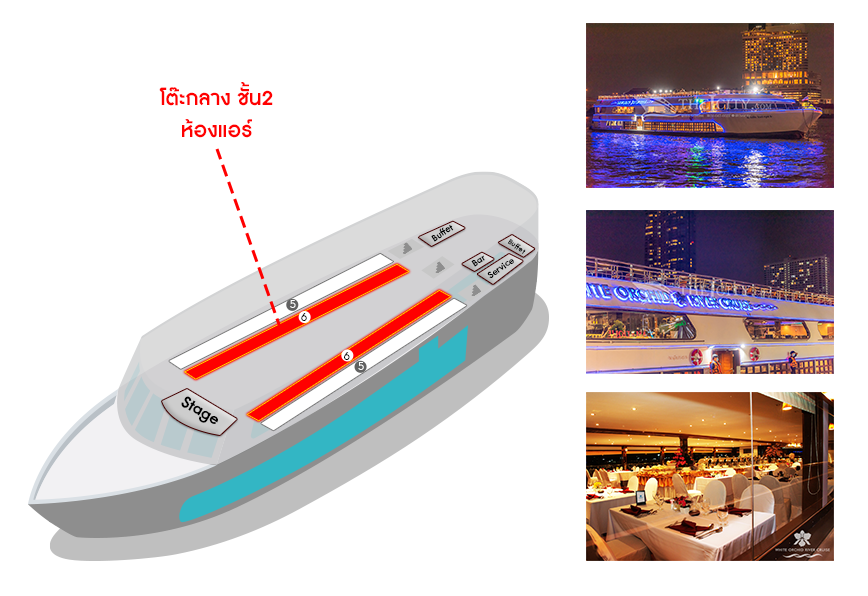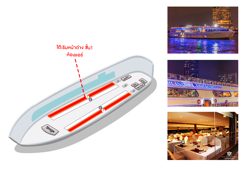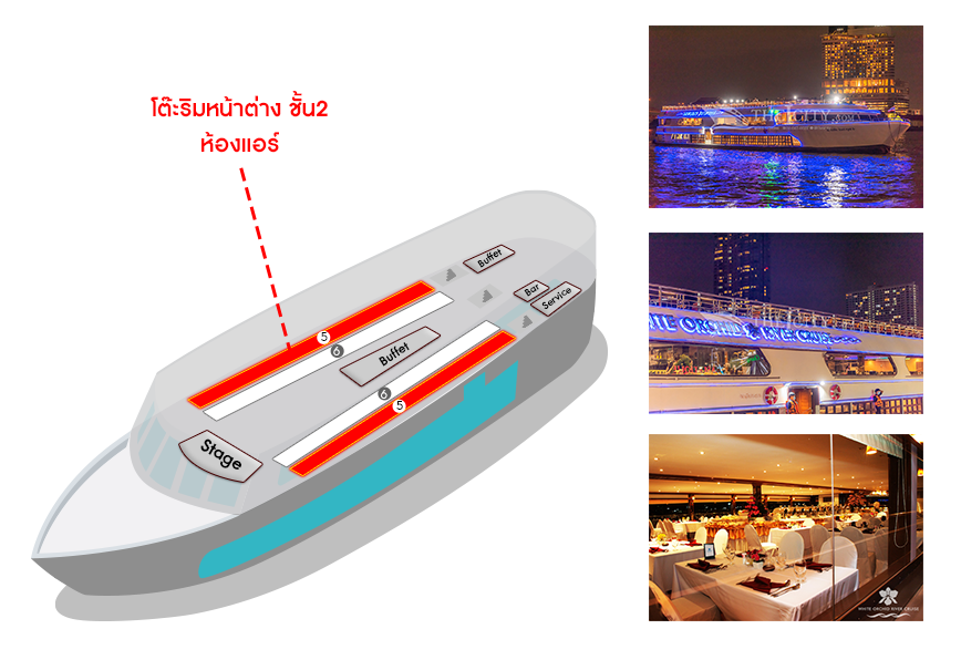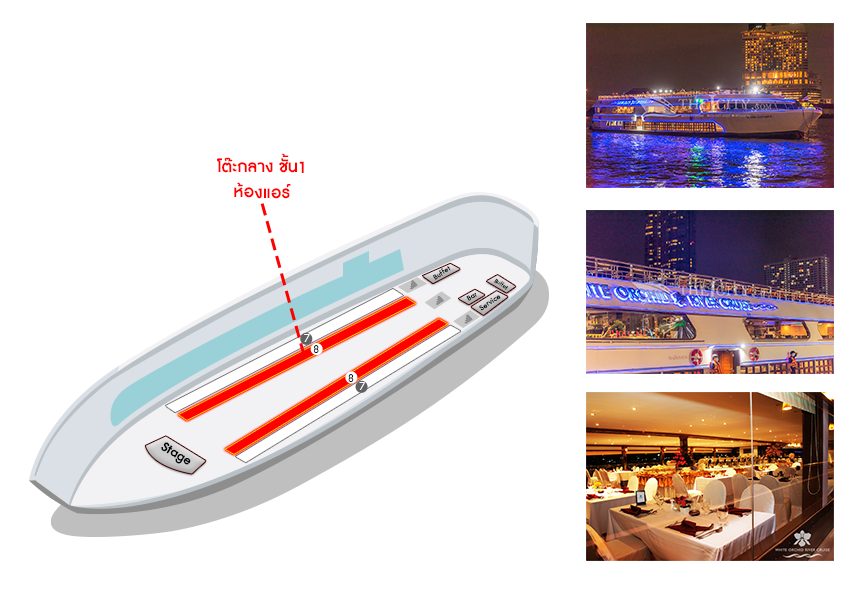 เรือ White Orchid River Cruise รอบ Twilight (Asiatique)| วัน | โต๊ะริม ดาดฟ้าชั้น3 ไม่มีหลังคา![]() คลิกดูรูปที่นั่ง |